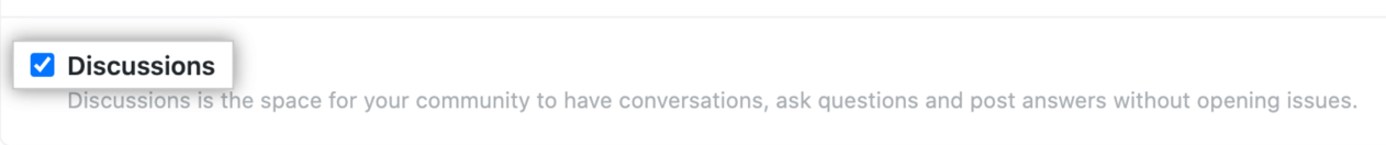 确认仓库处于公开情况之后,在 Settings 的 Features 选项卡中勾选 Discussions